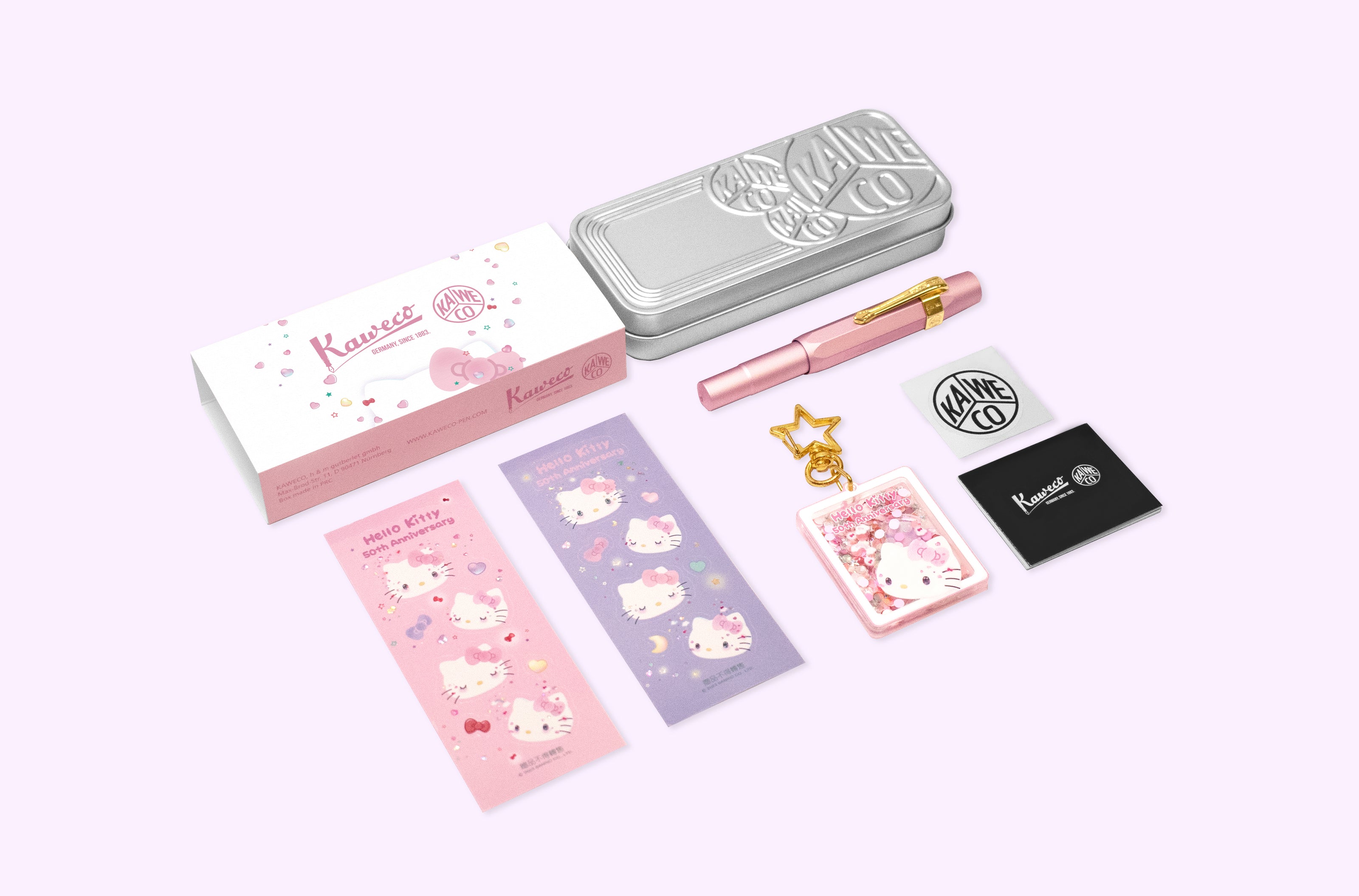 Kaweco品牌銀色金屬盒和設計精美的盒套。兩種顏色的盒套正反面皆有著不同的設計。一面由Kaweco經典標誌加上50週年經典的Kitty圖樣,巧妙地結合了東方與西方兩個知名品牌的設計;另一面則是可愛的半臉Kitty圖樣和閃爍的愛心、蝴蝶結,整體可愛又生動。