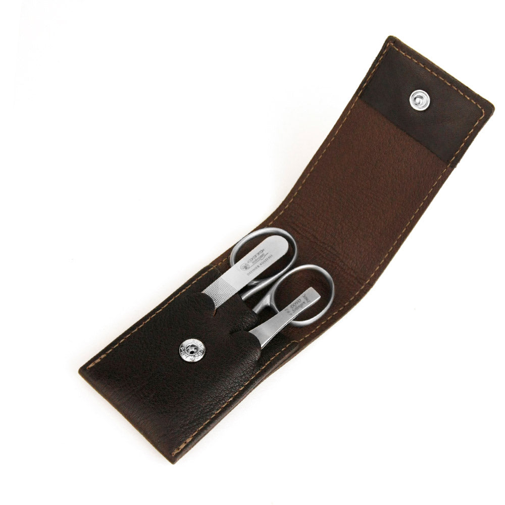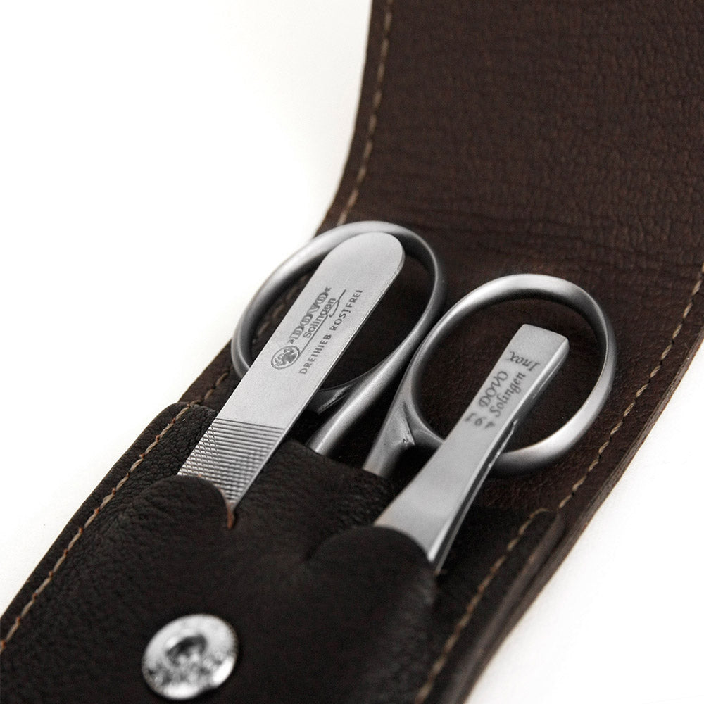 自1906年以來,德國索林根的Dovo一直生產優質傳統修容工具,以其工藝和質量而舉世聞名。修甲套裝包含四個必備的修甲工具,從最好的皮革皮套到頂級鋼材製修甲工具。