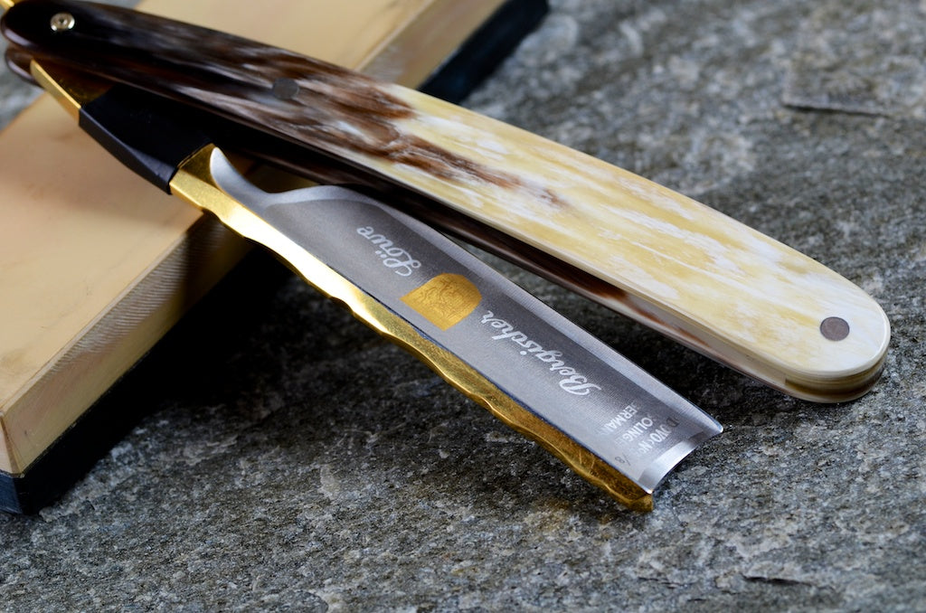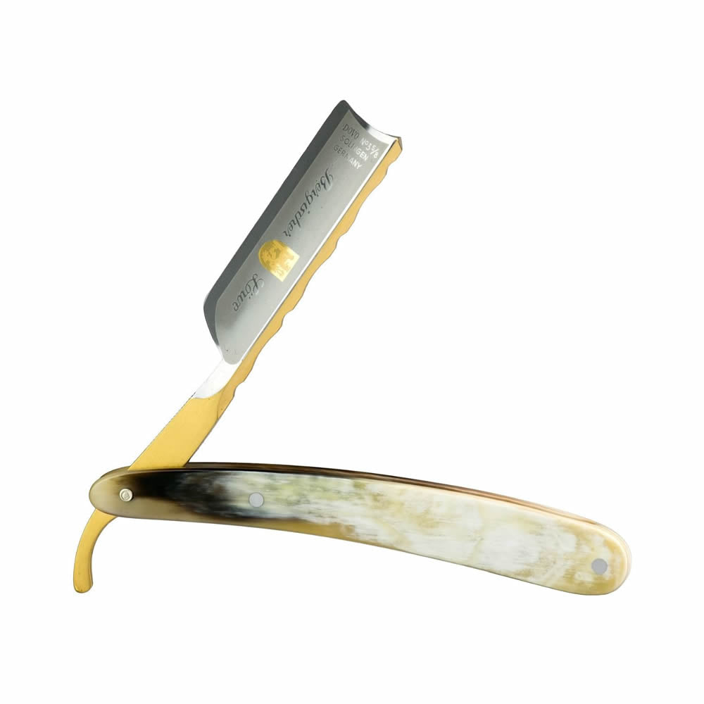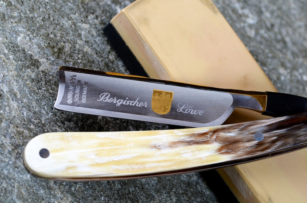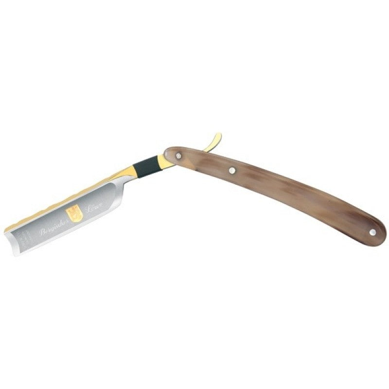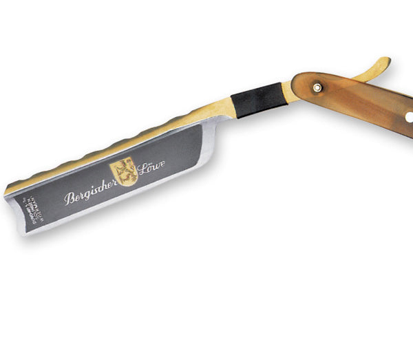 Dove"Bergischer Lowe"直式刮刀含5/8英吋刀鋒,結合獨特的工藝和效率。刀鋒為鏡面拋光且含黃金西班牙式頂蝕刻和雕刻刀脊的精細設計。手柄由純正天然的水牛角製成,透過傳奇的Dovo工藝師家族成員純手工拋光,水牛角的天然花紋成就了每把獨一無二的刮刀,適合男士的經典刮刀。