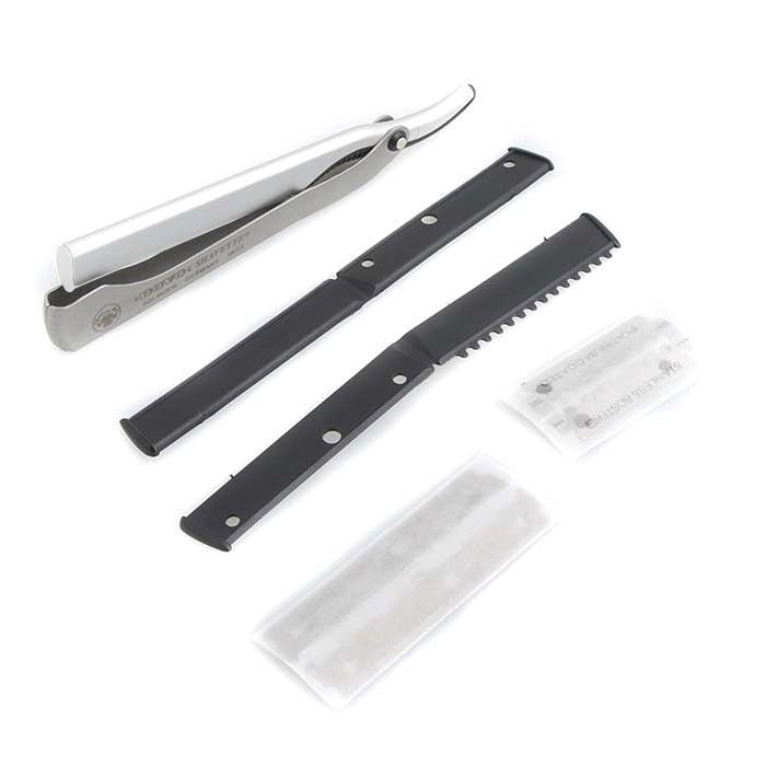 使用Dovo長刀片,長度接近標準長剃刀刀片。刀片可折成兩半。