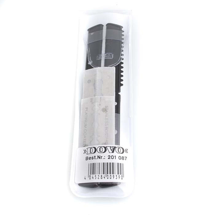 使用Dovo長刀片,具有鋸齒狀塑膠邊緣,更貼面,刮得更乾淨、更俐落。
