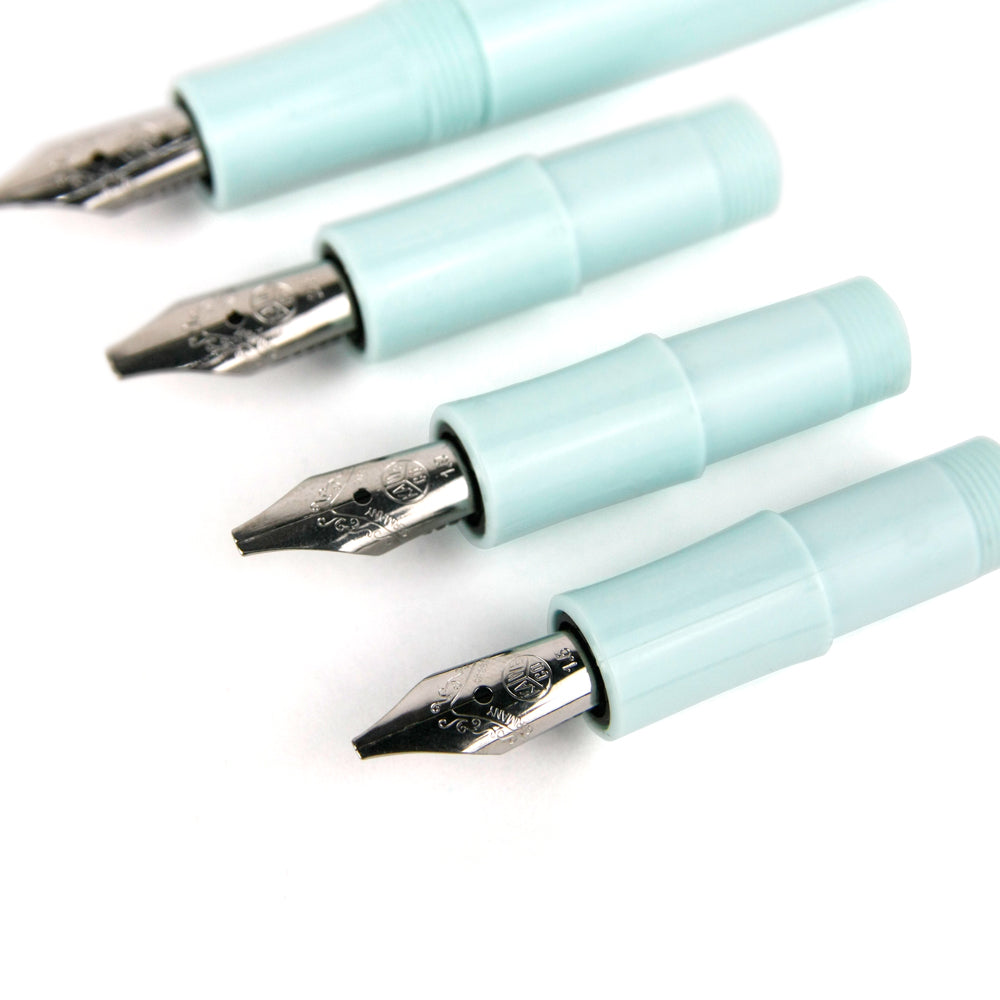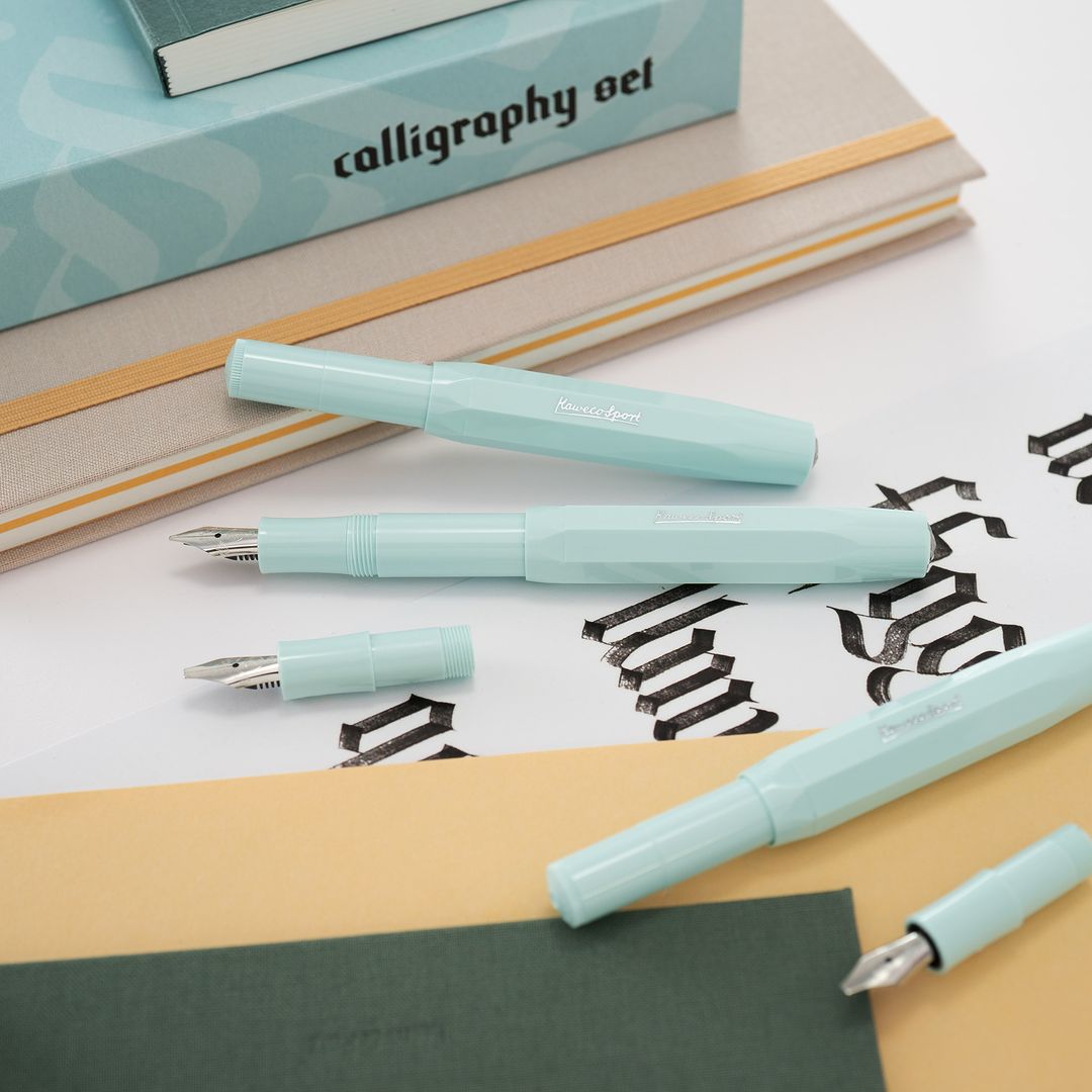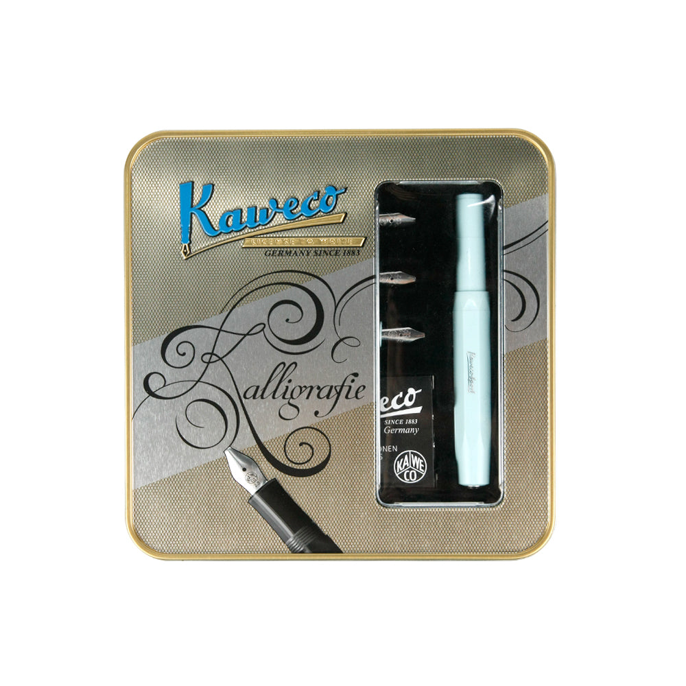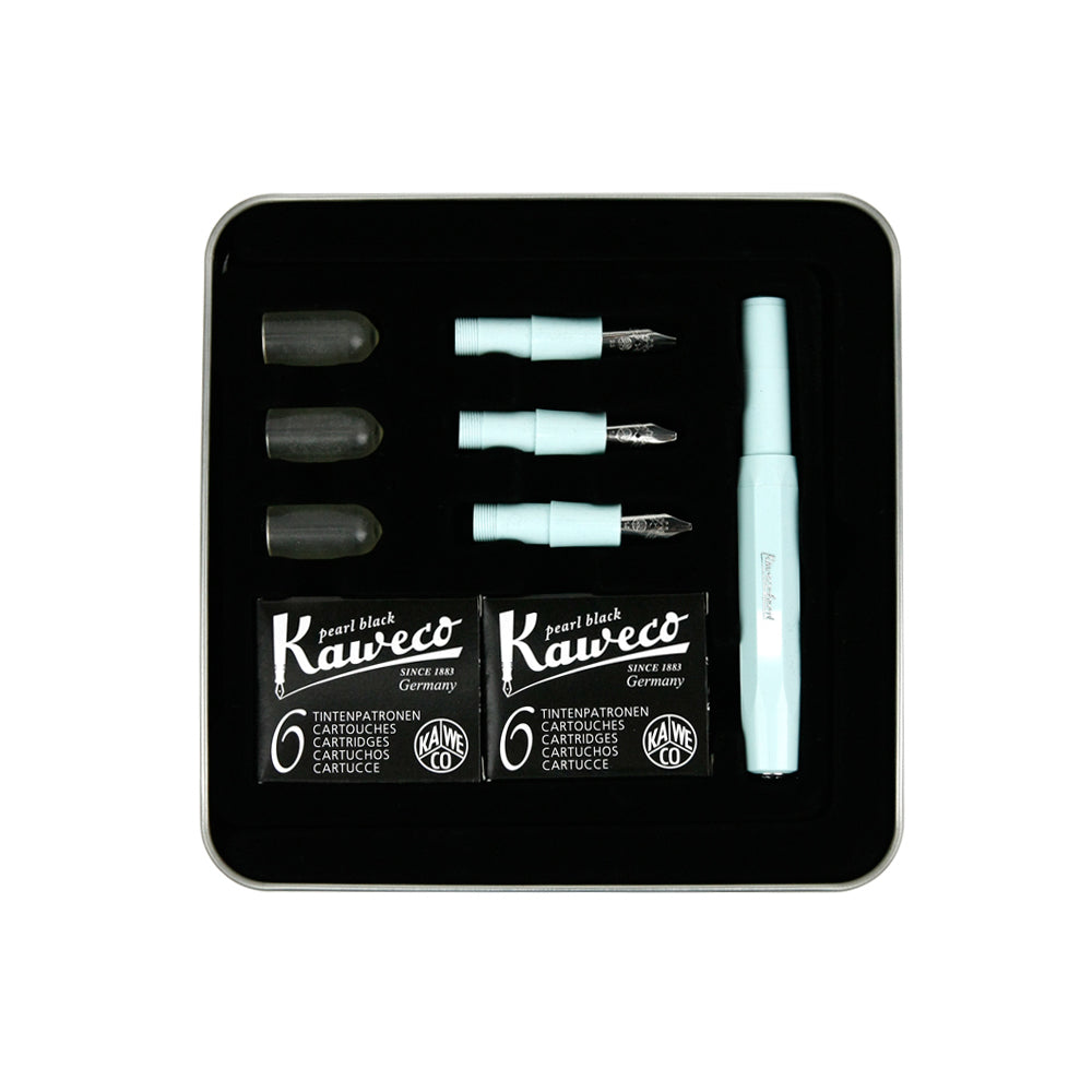 內含一支Kaweco經典鋼筆(薄荷綠)以及四組藝術尖筆頭(1.1mm,1.5 mm,1.9mm 2.3 mm)。
