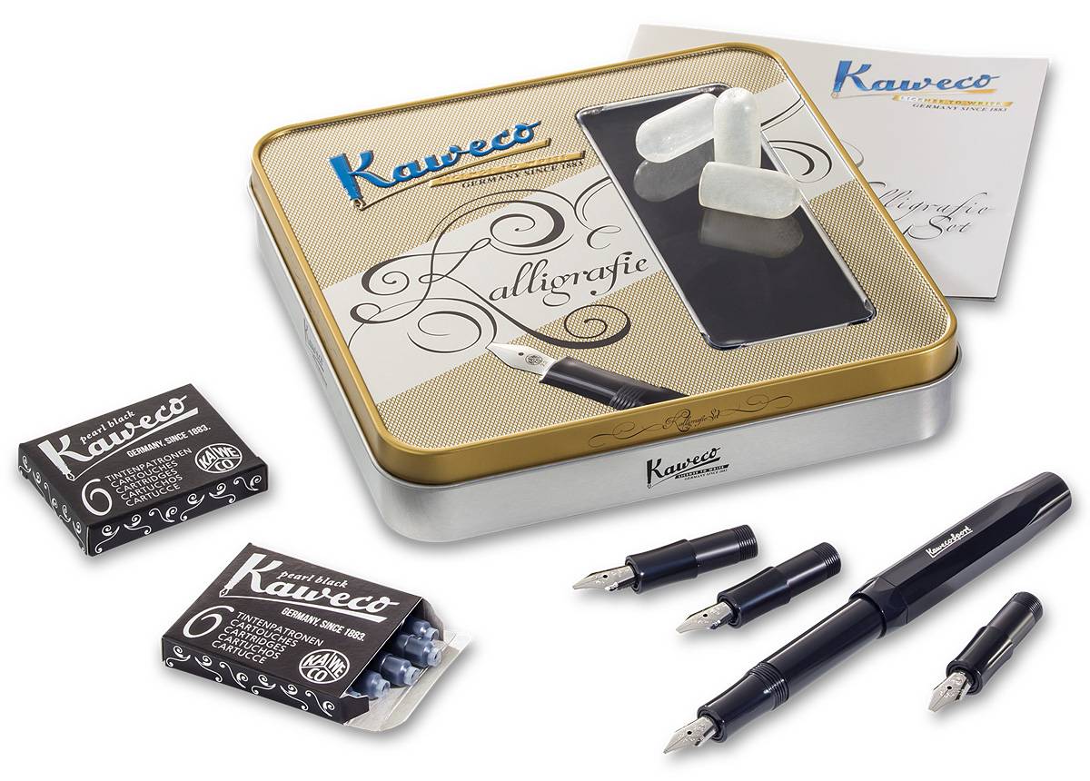 內含一支Kaweco經典鋼筆,以及四組藝術尖筆頭(1.1mm,1.5 mm,1.9mm 2.3 mm)。