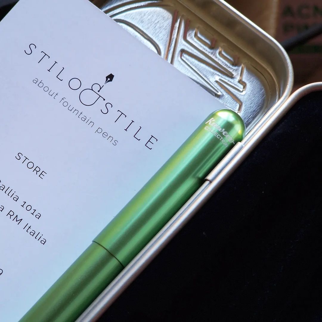 • Kaweco 銀色金屬筆盒,搭配 綠色紙盒外套