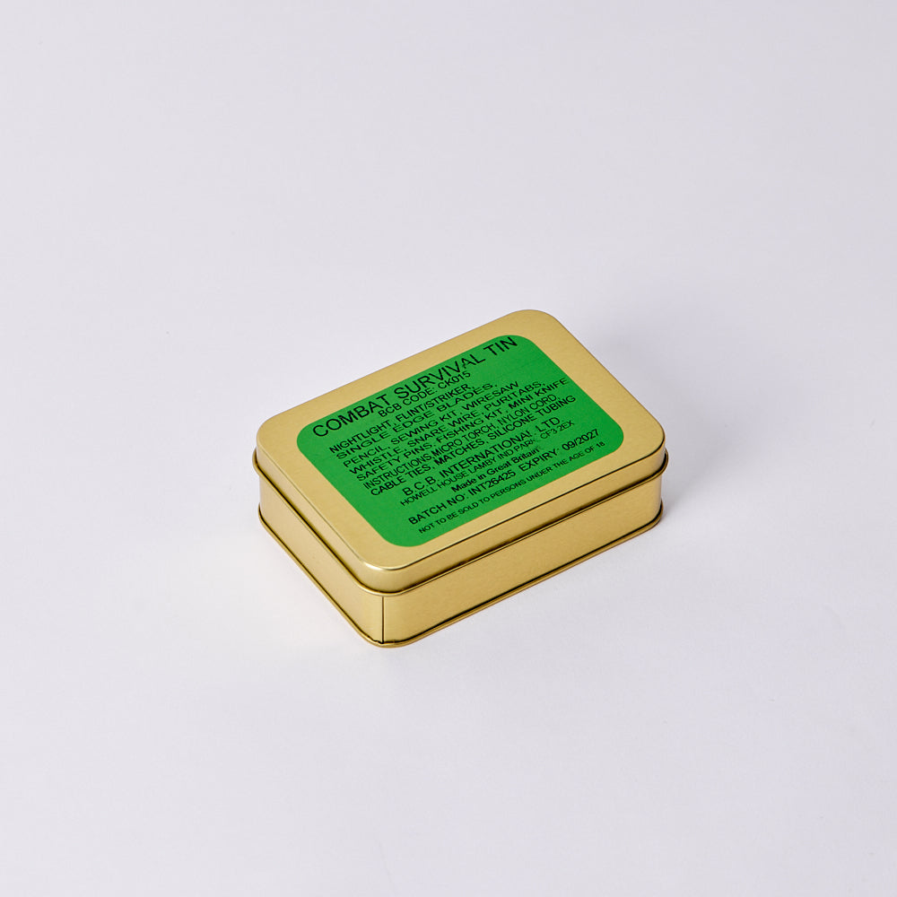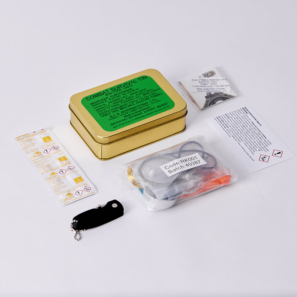 內容物包括:防水錫罐、膠帶、刀、火柴、鉛筆、淨化片、陷阱線、蠟燭、Fireball打火機和帶有指南針的打火石、釣魚工具包、哨子、縫紉工具包、安全別針