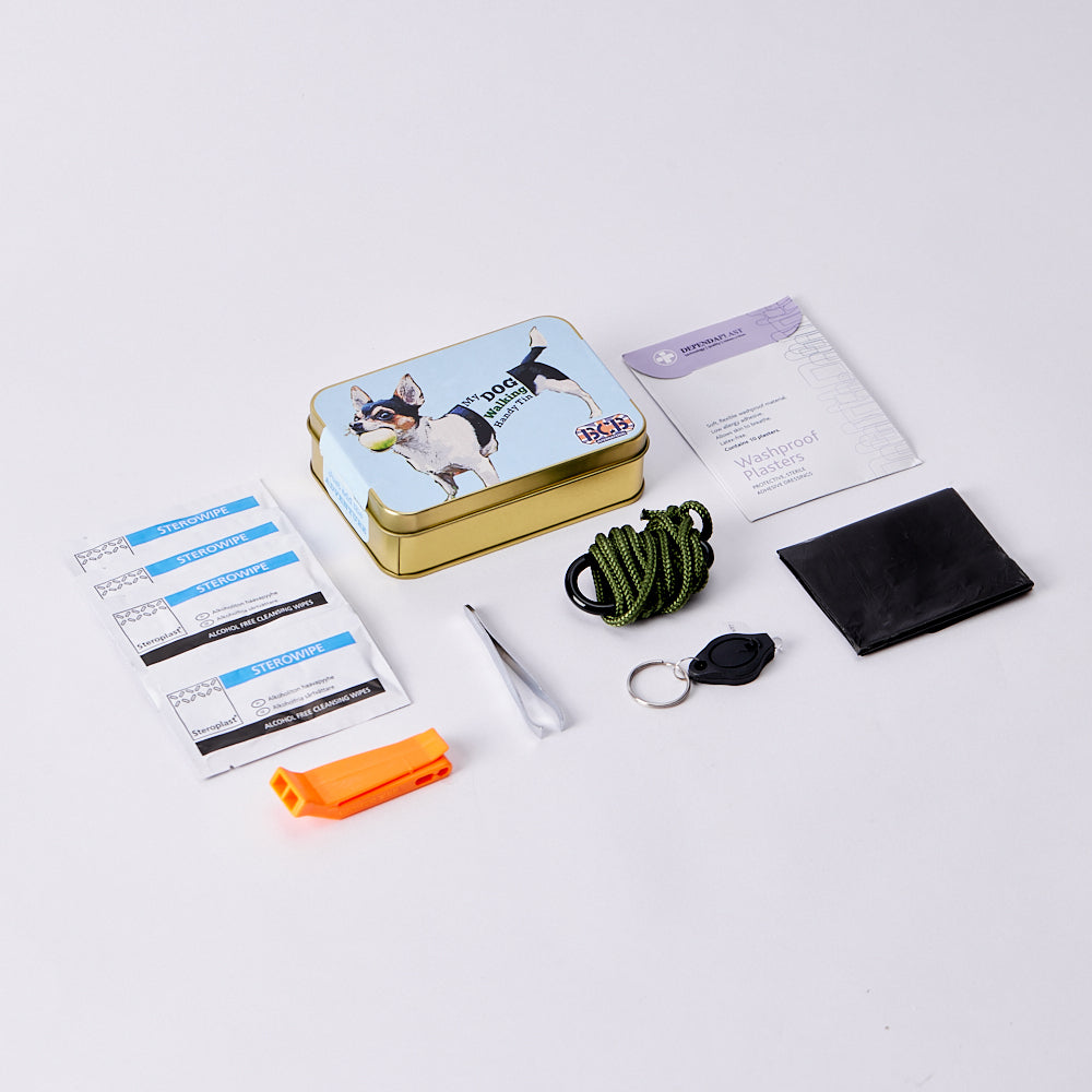 在遛狗時輕鬆放入口袋或包包中。高品質、輕巧、且方便攜帶。包含緊急狗繩,以防您的繩子斷裂或丟失,還有一支超亮的LED手電筒,供夜晚使用。另外還有一個聲音極大的哨子,可以用來召喚狗狗(如果擔心狗狗走失或跑得太遠),以及狗狗專用的便便塑料袋,讓您不會措手不及。此外,這支盒子還配有鑷子,可以用來拔除刺或蜱蟲,附帶殺菌濕巾,以幫助預防感染,以及防水的無菌膠布,適用於小傷口和擦傷。