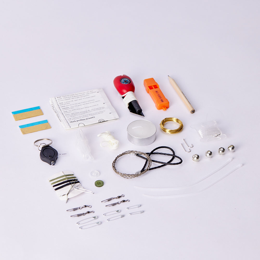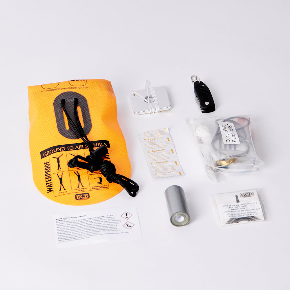 一個全新的防水可捲緊的袋子,內含由BCB為您精心打造的高品質生存套裝。